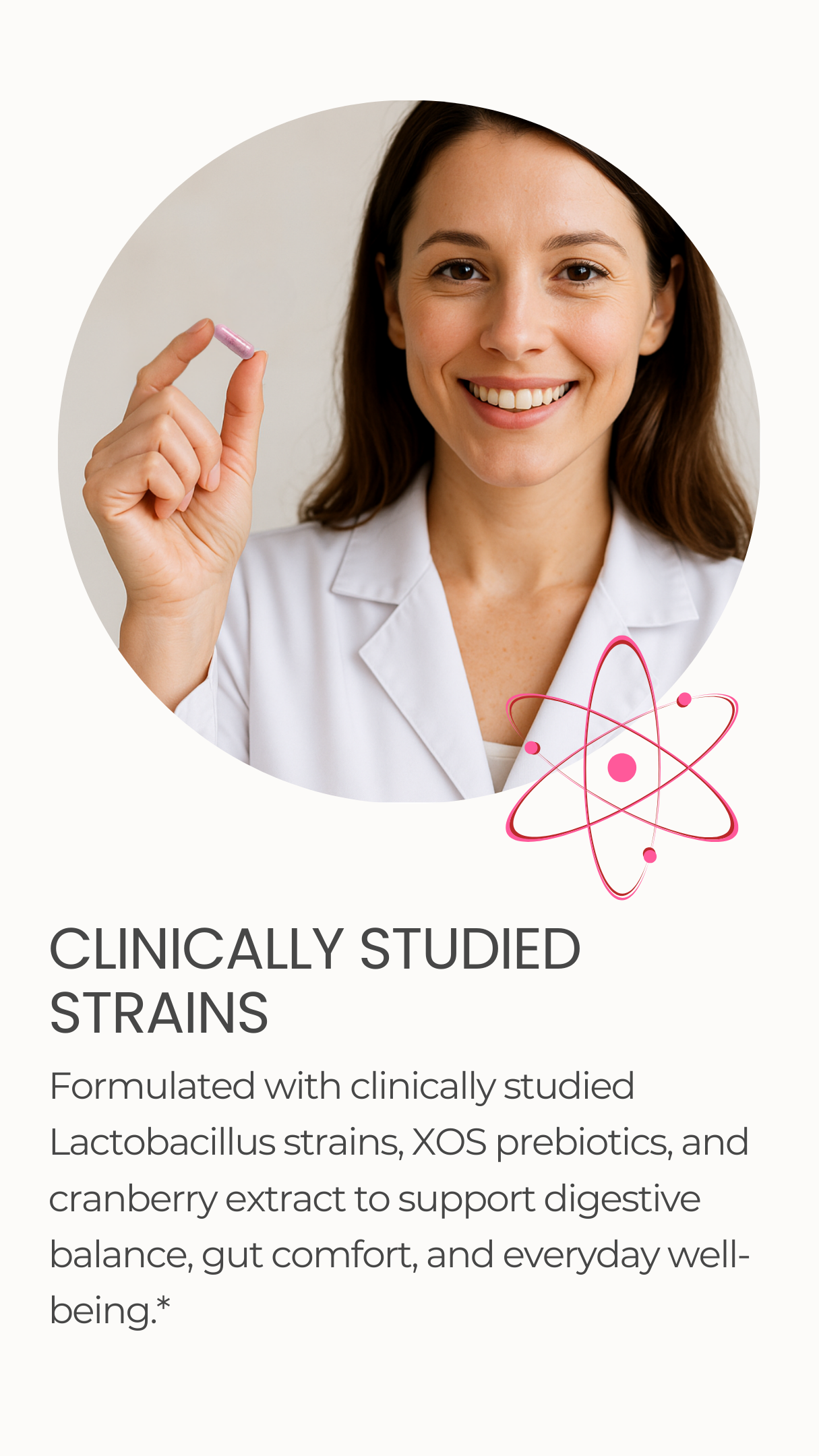 A powerhouse probiotic known for supporting a balanced vaginal microbiome, helping prevent yeast and bacterial overgrowth while promoting overall vaginal health